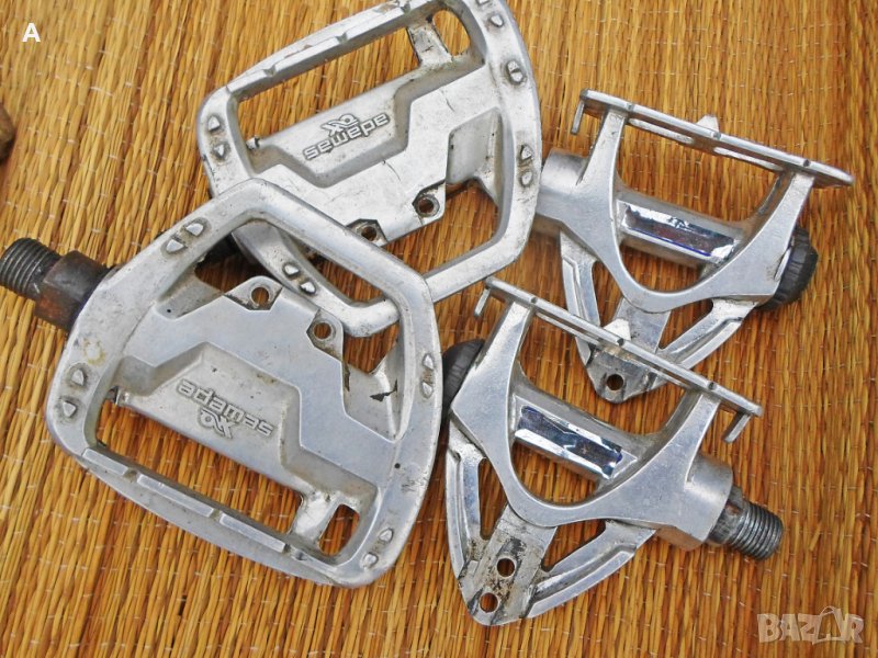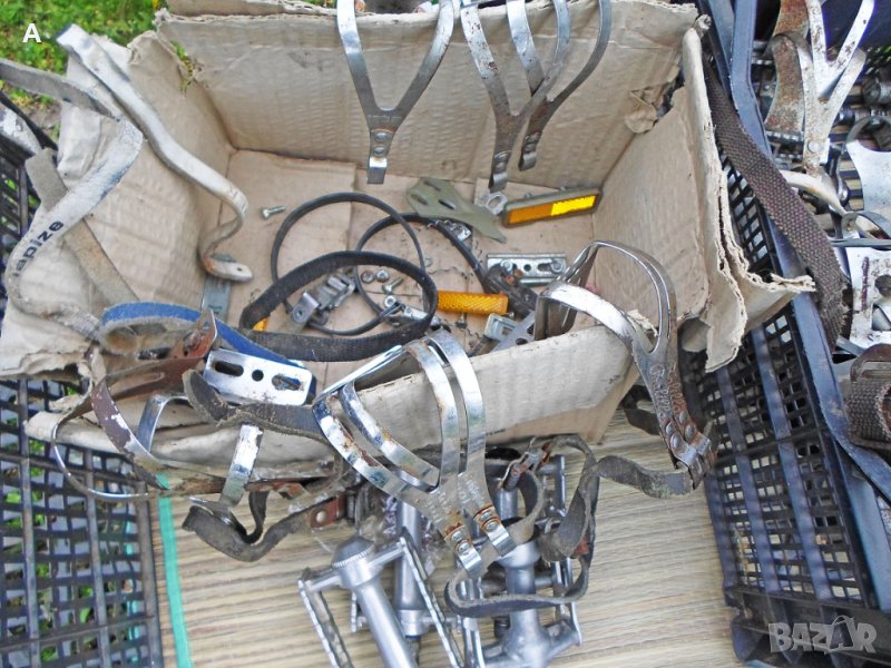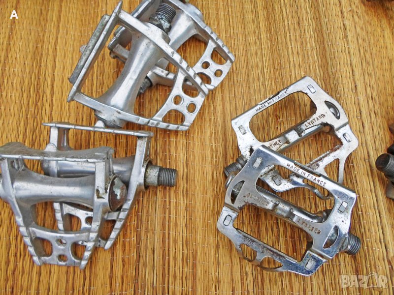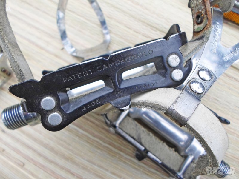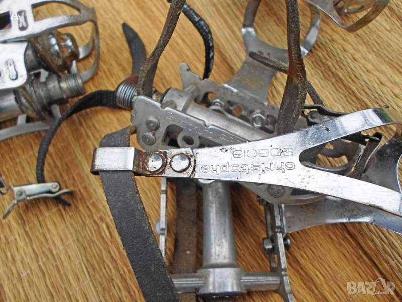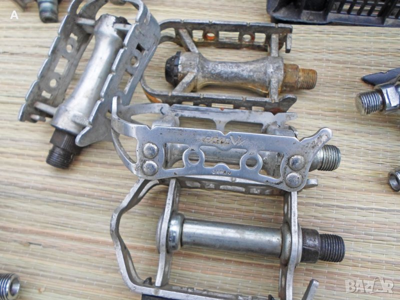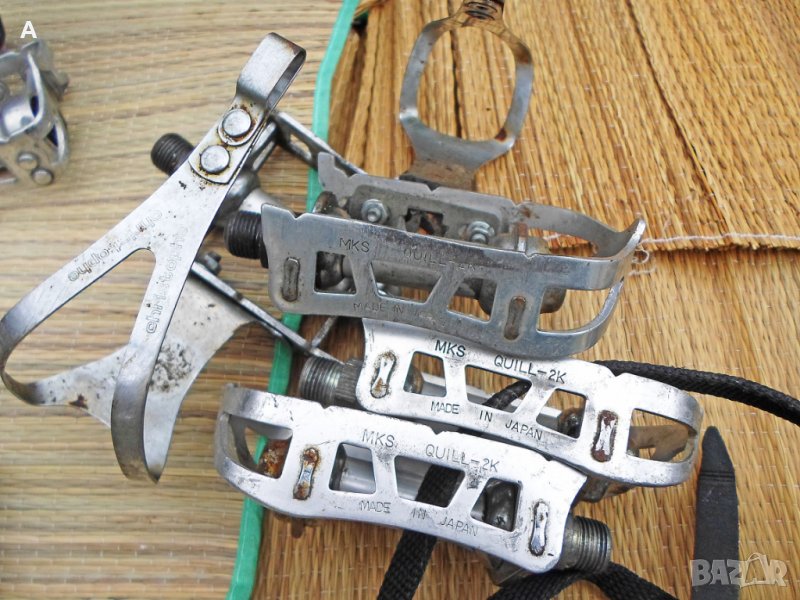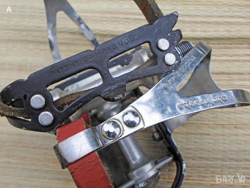 Ретро педали, някои перфектни, други със следи от времето. Имам няколко единични. Хубави куки нямам за продажба/тези от снимките ги подарявам, имат ръжди/.Shimano ,Mailard,Lyotard,MKS,KKT цени по договаряне/питайте, ще ви пратя подробни снимки с цена/. Твърди цени на WAY Assauto 130 лв,Campagnolo Record 270 лв/белите каишки/,Campagnolo Record 170 лв/червените каишки/