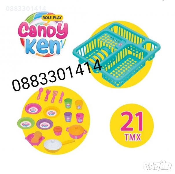 Детски сушилник за чинии в комплект с чинии, чаши, прибори, гевгир, тенджера и тиган.