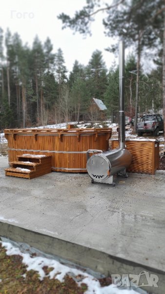 Басейна е с размери4/2/1м. Изграден е изцяло от дърво. Към комплекта включваме-стълба,4бр.дървени капаци,2 бр.сифони с кранове,2бр.вливни дюзи,скимер . Цената е без печката.