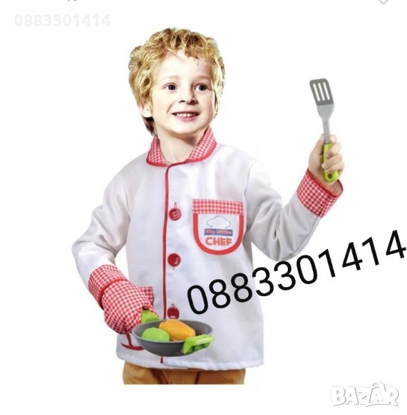 Детски костюм на главния главния готвач в комплект с аксесоари - шапка, ръкавица, дървени готварски инструменти - лъжица, вилица и нож и 3 мерителни лъжички с различни размери.