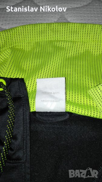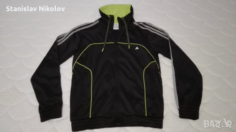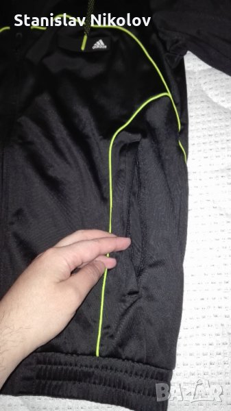 продавам горнище Adidas. Горнището има две емблеми, отпред на гърдите и на гърба. Състоянието е изключително запазено. Горнището има два джоба с ципове. Яката е висока и може да се регулира с връзките.