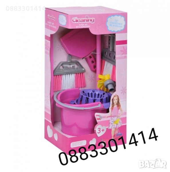 Детски комплект за почистване, включващ голяма четка с дръжка, моп с дръжка, малка четка, лопатка и кофа за мопа в ярки цветове.