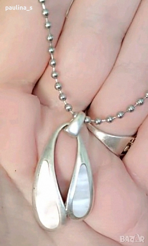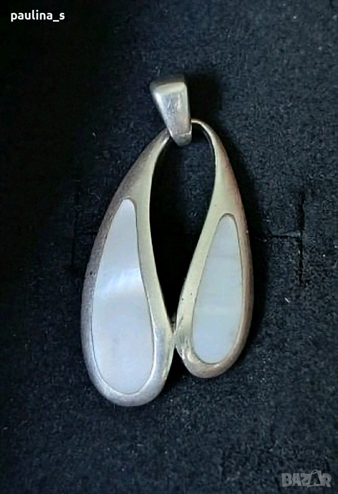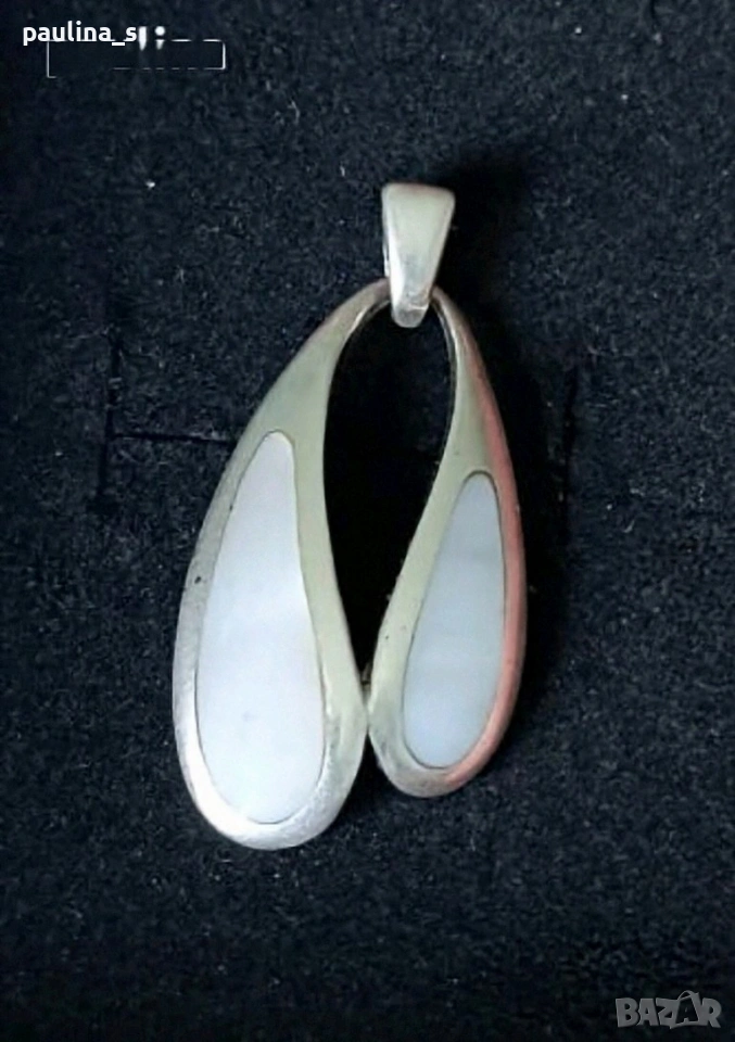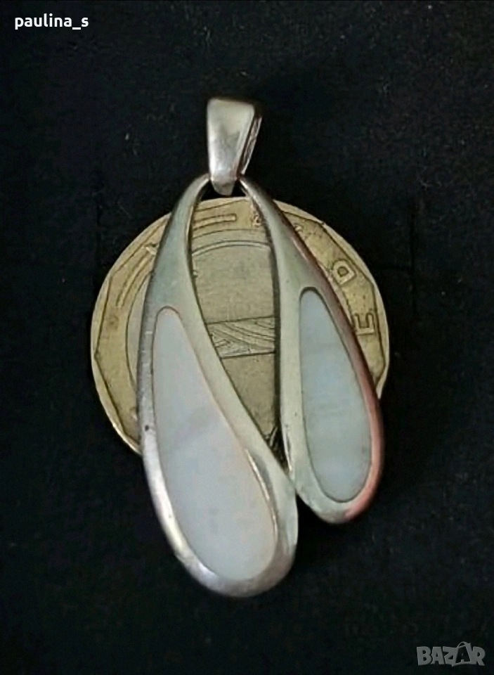 2️⃣. Масивна сребърна висулка / педантив със седеф. Цената е крайна, без пазарлъци 35 евро. Двойно маркирана висулка от Мексико, много ефектно бижу. Мащабирането е на дланта и с монета, не се продава на грамаж.