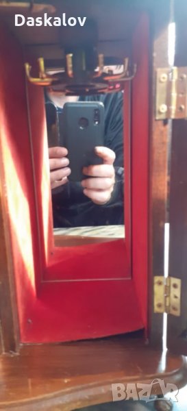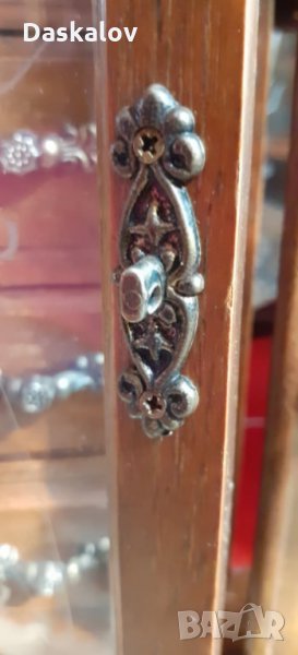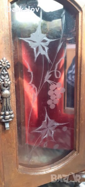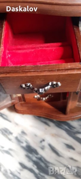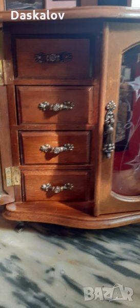 Много красив дървен бижутерник с размери 40/30см материал дърво съчетан с красиви метални дръжки и закопчалки ,стъклени вратички с гравирани картини по тях,четири малки чекмеджета за пръстени от едното крило и въртящ механизъм за гердани в другото крило метални крачета. Запазено Внос Германия! Разгледайте и др. мои обяви! Благодаря!