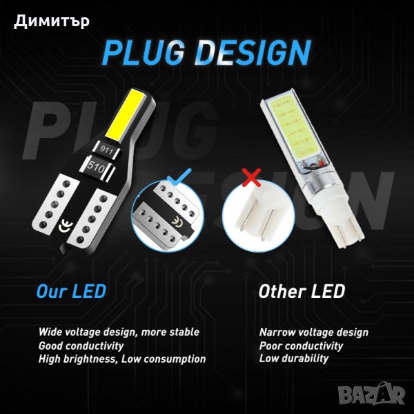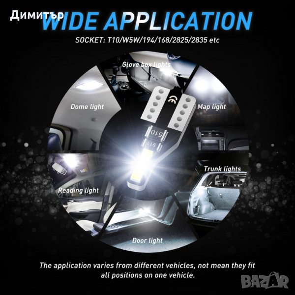 T10 / T15 / 194/168/158/12256/12961/2821/825 / W5W. Съвместим и с 21/912/516/579/917/918/920/922/923/906/904/916