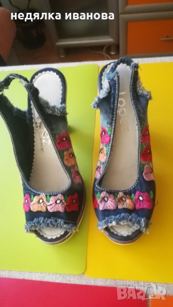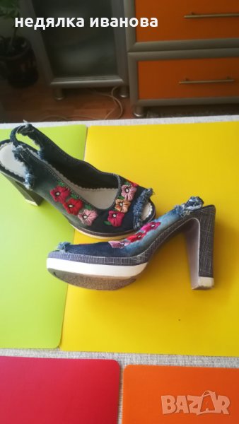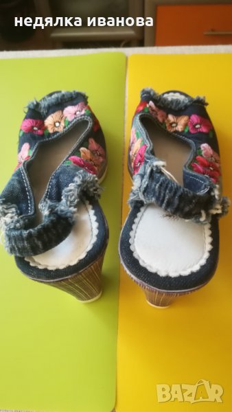 Сандали от дънкови плат с извезан цветя. Отлично състояние. Височина ток-11см.платформа отпред-2см.,стелка-24.5см.Изпращам чрез Еконт с преглед и тест.