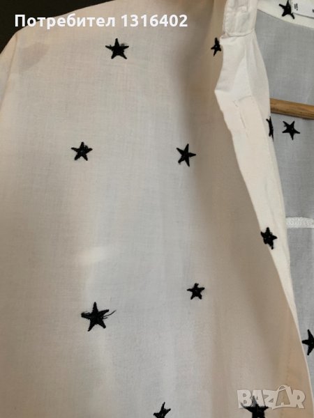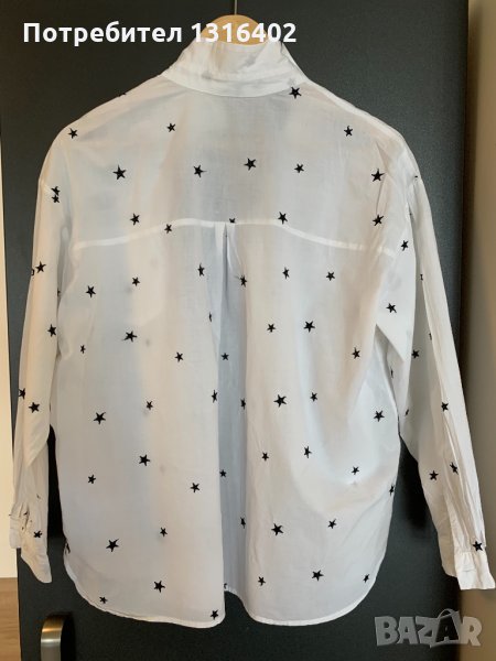 Риза oversize, размер S,бяла памучна с черни звезди, марка Mango, ширина под мишници 53см,дължина 65см,ръкав 50см.