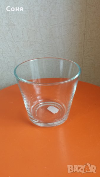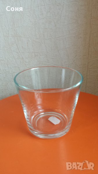 Стъклена кашпа нова с размери 10 см. висока и 10 см. диаметър, подходяща за аранжировка на цветя и сукуленти .