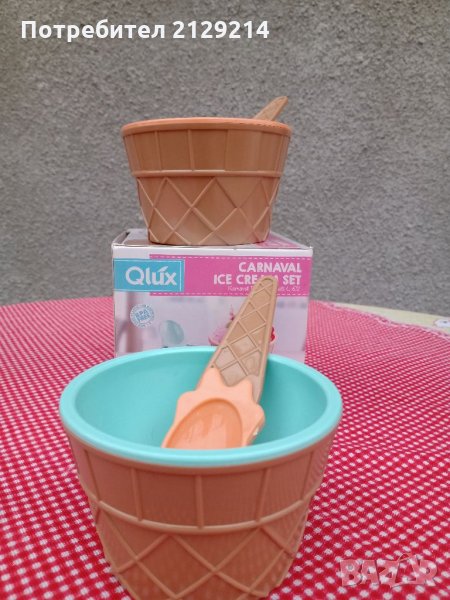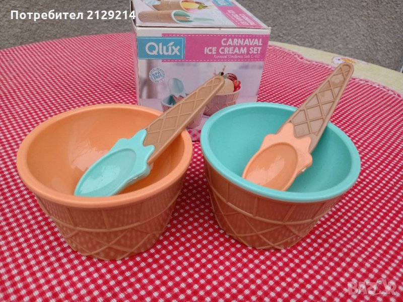 Комплект от две пластмасови купички с лъжички за сладолед. Наличен е един комплект.