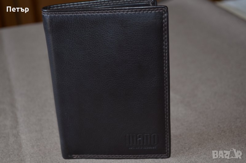 Портфейла е чисто нов и в оригиналната си кутия. На Германската фирма Mano 1919 е и е от серията Sutura с номер на модела "М19010 Braun". Изработен е от мека тъмнокафява естествена кожа. Портфейлът има общо: