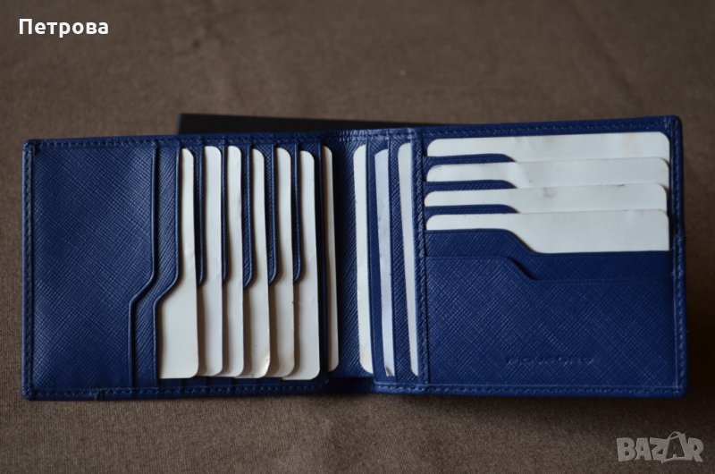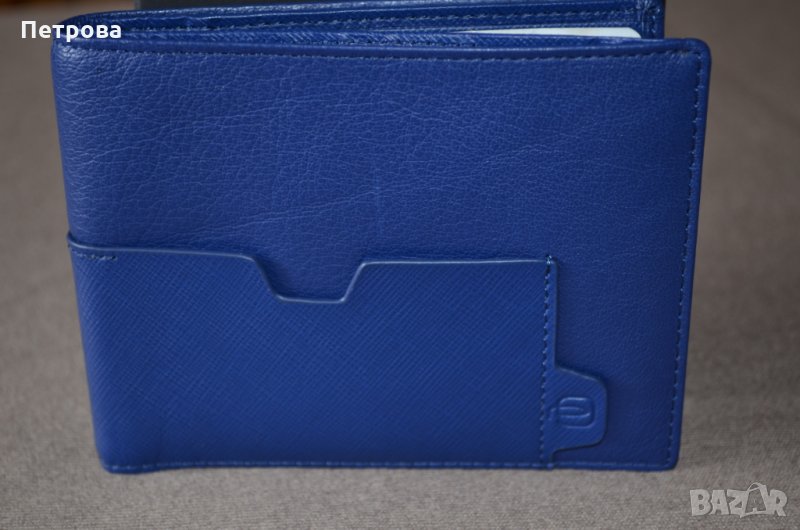 Портфейла е чисто нов и в оригиналната си кутия. На Италианската фирма Piquadro е и е от колекцията Euclide с номер на модела PU1241S73/Blu2. Хоризонтален тип е. Изработен е от синя естествена кожа тип ”Сафиано”, която е по здрава и издръжлива и много приятна на допир. Подплата от полиестер от вътрешната страна. Портфейла разполага с множество от отделения за карти или: