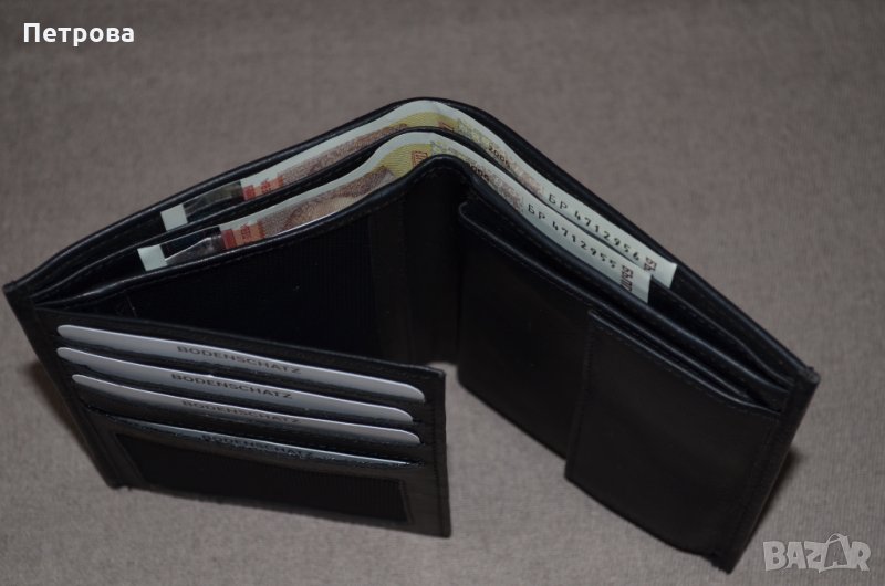 Портфейлът е чисто нов и в оригиналната си кутия. 100% оригинален на фирмата Bodenschatz, вертикален тип, моделът е Sierra 8-459 SE 05. Изработен е от естествена кожа, която е изключително мека и приятна на допир. Моделът разполага общо с:
