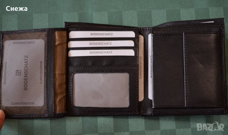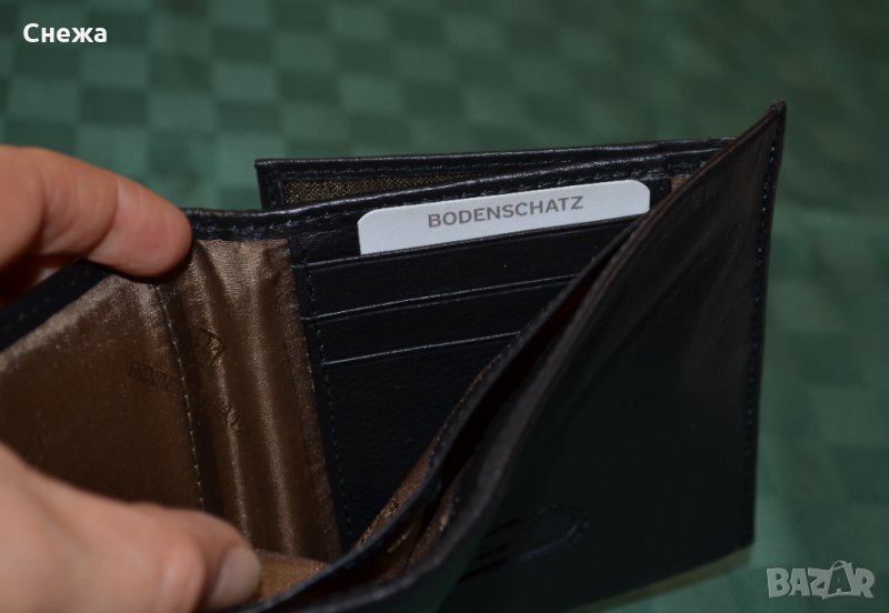 Портфейла е чисто нов и в оригиналната си кутия и е на Германската фирма Bodenschatz от колекцията Catania, а номера на модела е 8-286 СА. Вертикален тип е и е изработен от мека черна естествена кожа с подплата от плат от вътрешната страна. Портфейла разполага общо с: