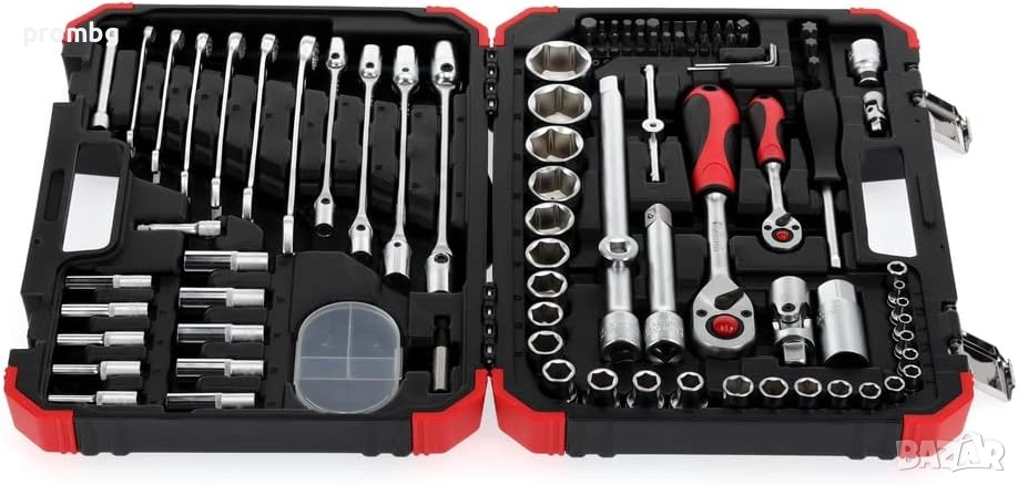Gedore Red Socket Комплект гаечни ключове 1/4 "+ 1/2", 92 части, гедоре. Комбинирани гаечни ключове, (вътрешен) шестоъгълник, шестостени, торксови ключове, вложки кръстати PZ и PH, различни размери (1/4 " и 1/2"), висококачествени двупосочни тресчотки и др. Здрав пластмасов калъф в червен дизайн на Gedore. Всички накрайници и инструменти са изработени от висококачествена хром-ванадиева стомана и имат матово хромирано покритие. Размери (ДхШхД): 383 x 272 x 80 мм, тегло: 6 кг.