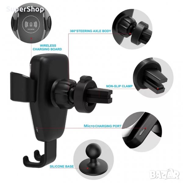 Иновативна 2в1 гравитационна стойка с безжично зареждане за мобилен телефон в превозното ви средство. Така вашият телефон винаги ще бъде на една ръка разстояние и със заредена батерия.