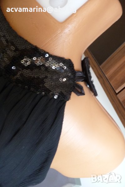 Черна ефирна рокля с тънка подплата .Кройката е свободна и може да се носи и от дами с по- голям размер .По врата и бордюра отдолу има пайети .Отлично състояние , без следи от носене.