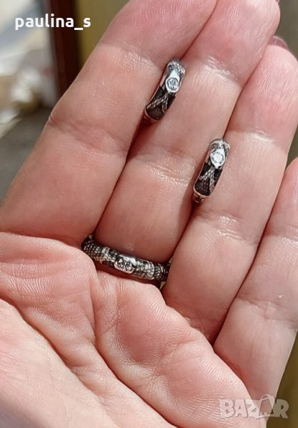 1️⃣ Японски дизайнерски комплект. Цената е крайна 199,99лв / 100 евро. Състои се от обеци и пръстен в змийски принт в черно и сиво, покрити с емайл. Камъните са моисанит / lab диамант. Маркировката е 925(титър за съдържание на благороден метал в сплавта-сребро 92,5%).