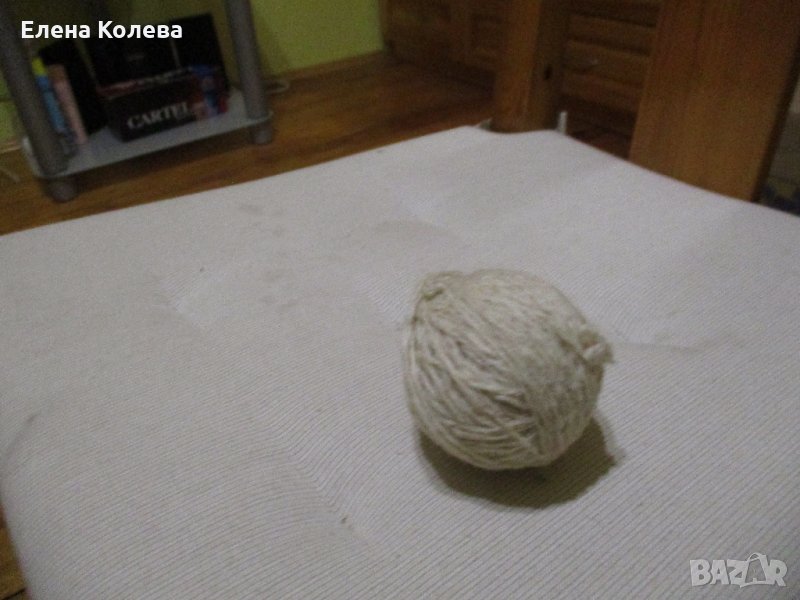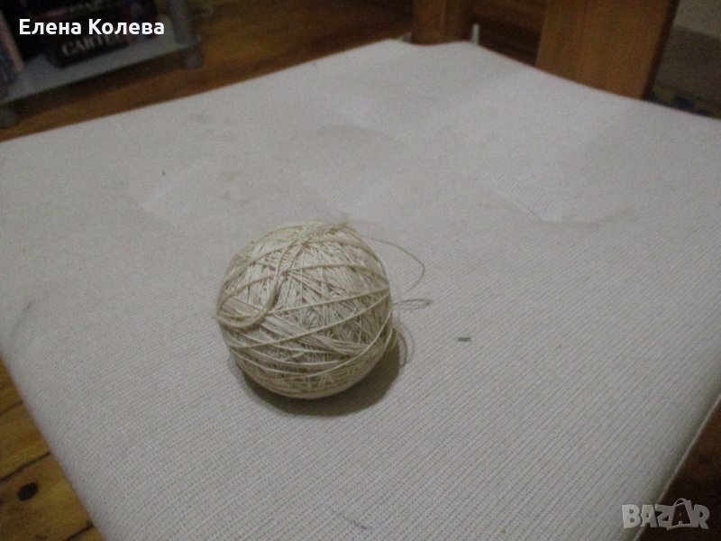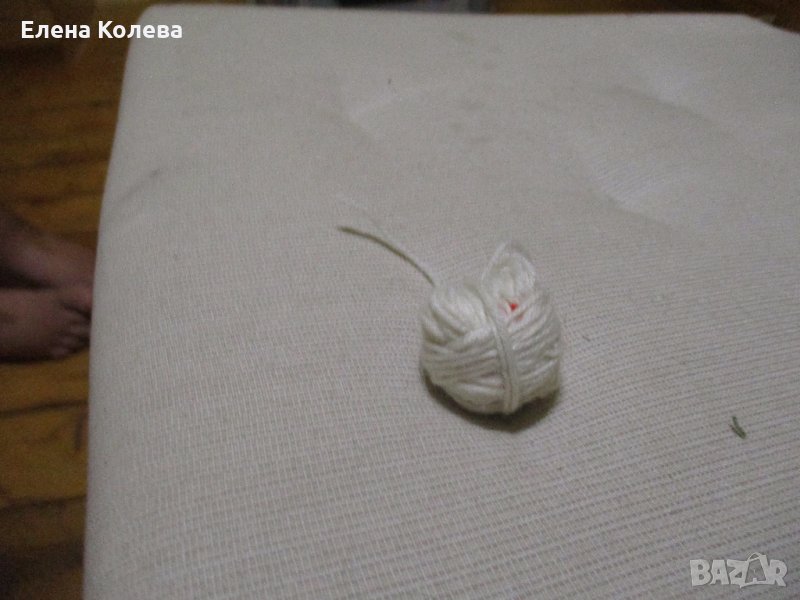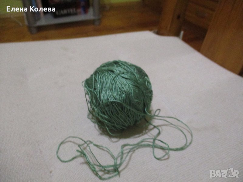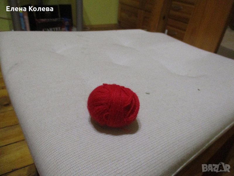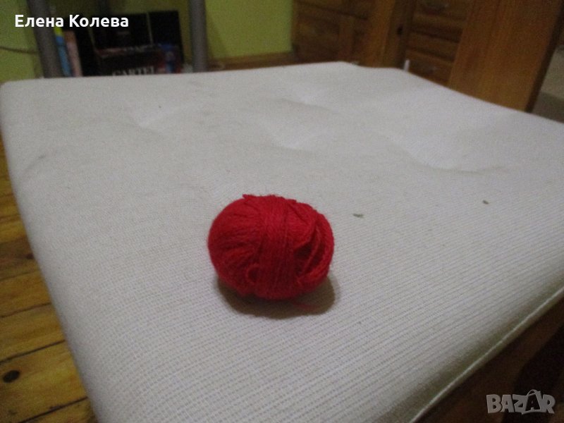 Копринено зелено за бродиране; бяло вълнено тире – 3 бр.; сиво вълнено; червено перла; бяло памучно.