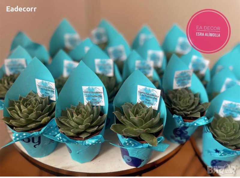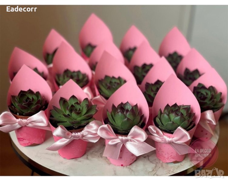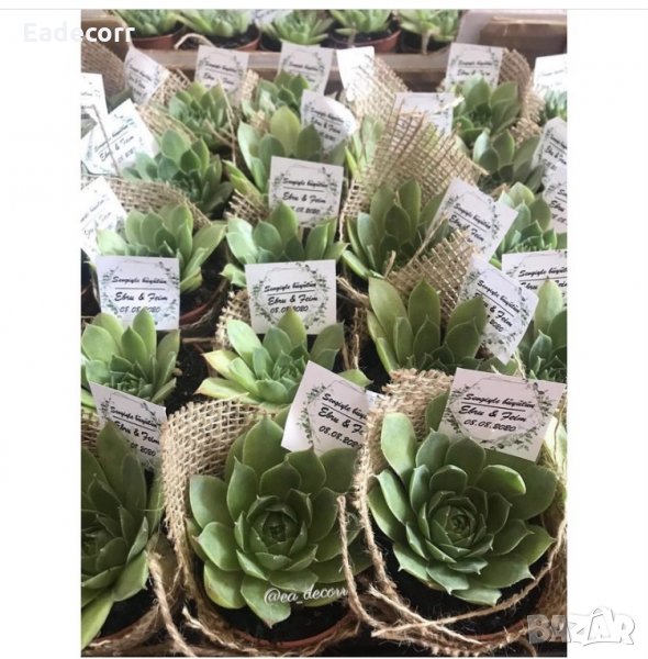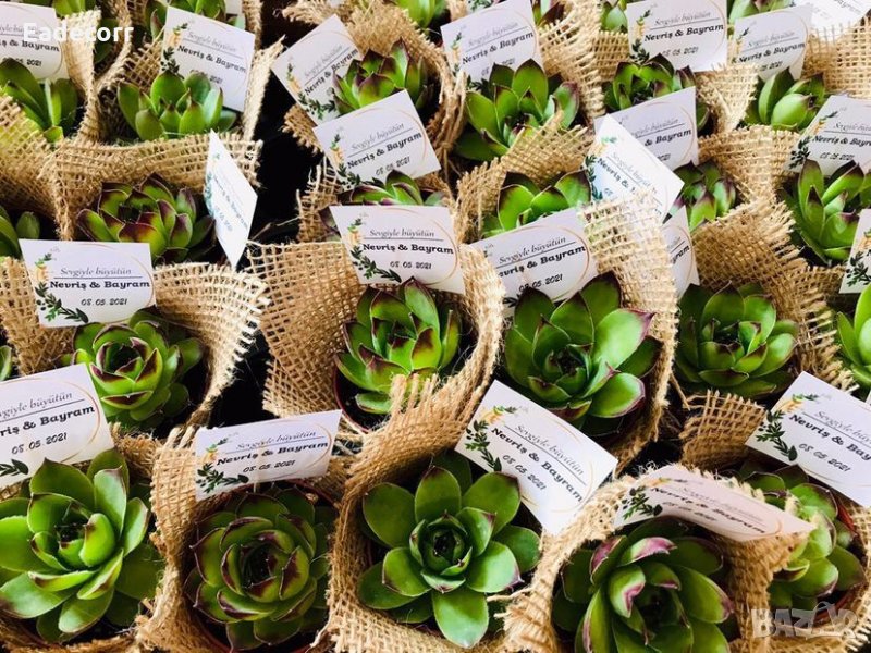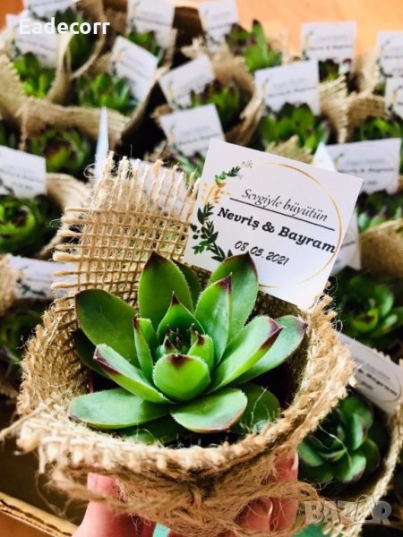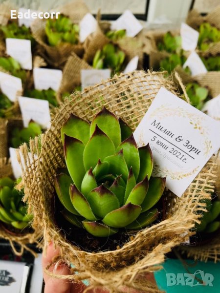 Украсени сукуленти. Идеален подарък за гостите. Изработват се по предварителна поръчка. Време за изработка: 4-5 дена. При повече бройки цената търпи промени.