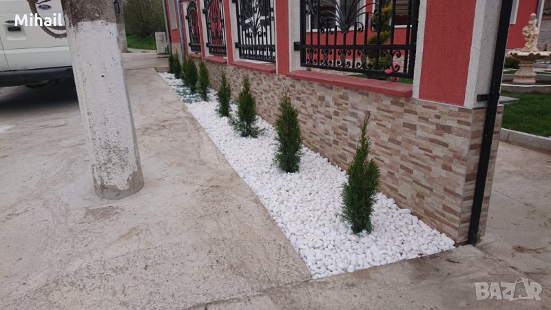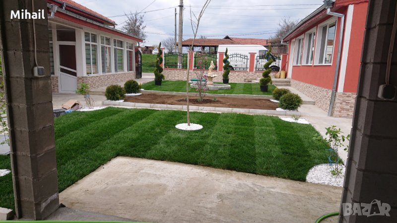 На останалите снимки- също последни завършени проекти: Частен дом в Исперих- цялостно изграждане на градината- растения, мулч, декоративни камъни, затревяване с тревен чим, изкуствена трева на бул. '' България'' пред магазина на Техношоп, Частен дом в Пловдив- изкуствена трева, Тревен чим и инсталиране на напоителна система при ''Мотомания'' и детски център ''Рая''- Пловдив, Смирненски.