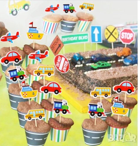 10 бр Превозни средства самолет кола автомобил автобус кораб влак топери украса за мъфини кексчета → Обява 32794049