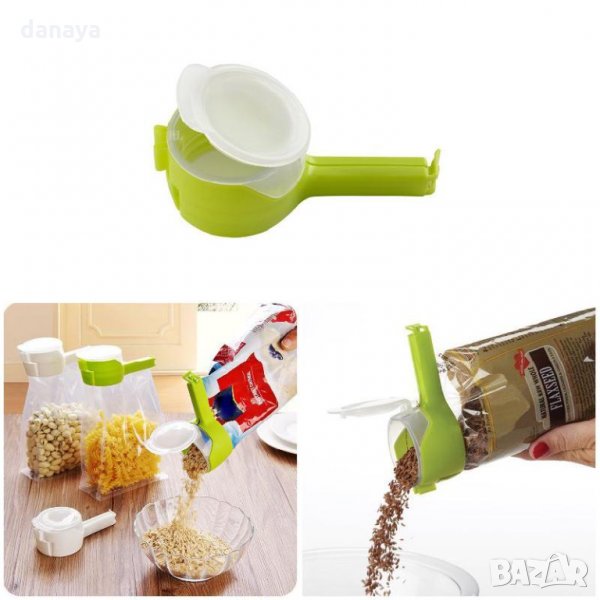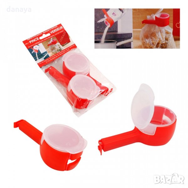 Комплект от 2 броя щипки за торбички с капачка за отсипване на насипни продукти. Клипс за затваряне на вече отворени пакети като например кафе, ориз, брашно, сол, захар и т.н. без да е нужно да откопчаваш щипката всеки път щом искаш да отсипеш от съдържанието в плика. Щипката защипва здраво плика и не позволява разсипване на продукта в него.