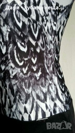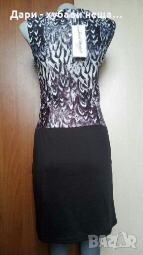 Роклята е от фин неопрен, без подплата на полата(вътрешната част е гладка и няма да полепва).Закопчаването е от едната страна, с удобен скрит цип.Кройката е с ниска талия.Цветната горна част е в основни цветове черно и бяло, като се виждат леки пастелни нюанси на синьо и много светла пудра.