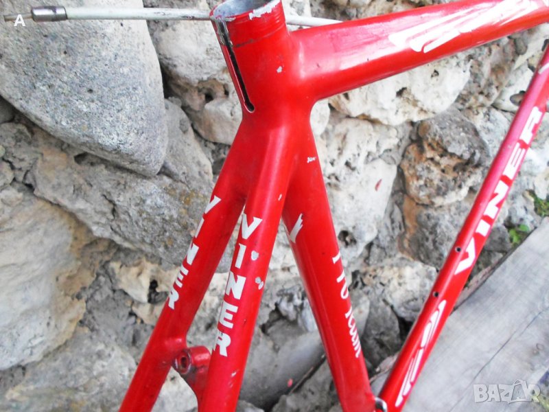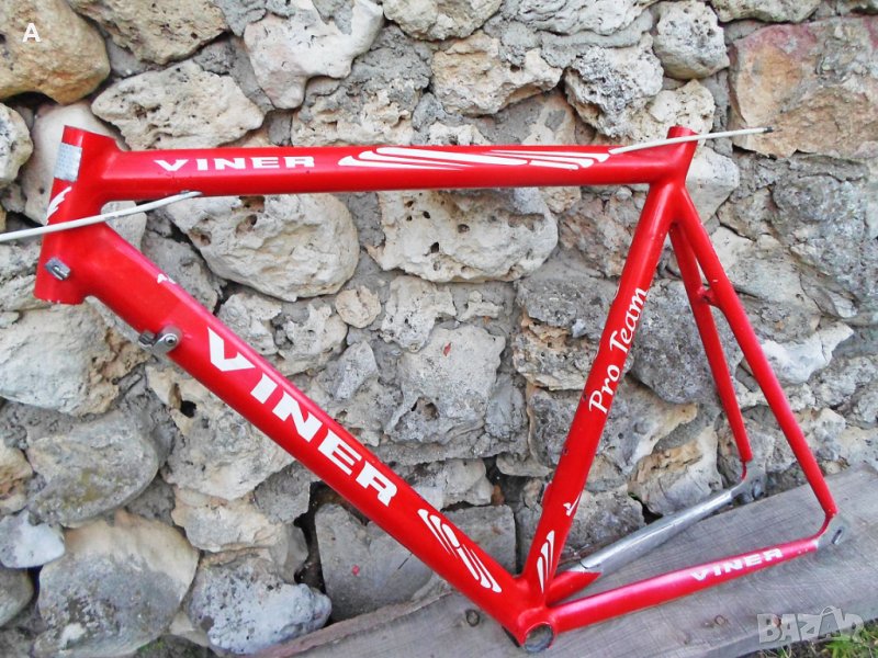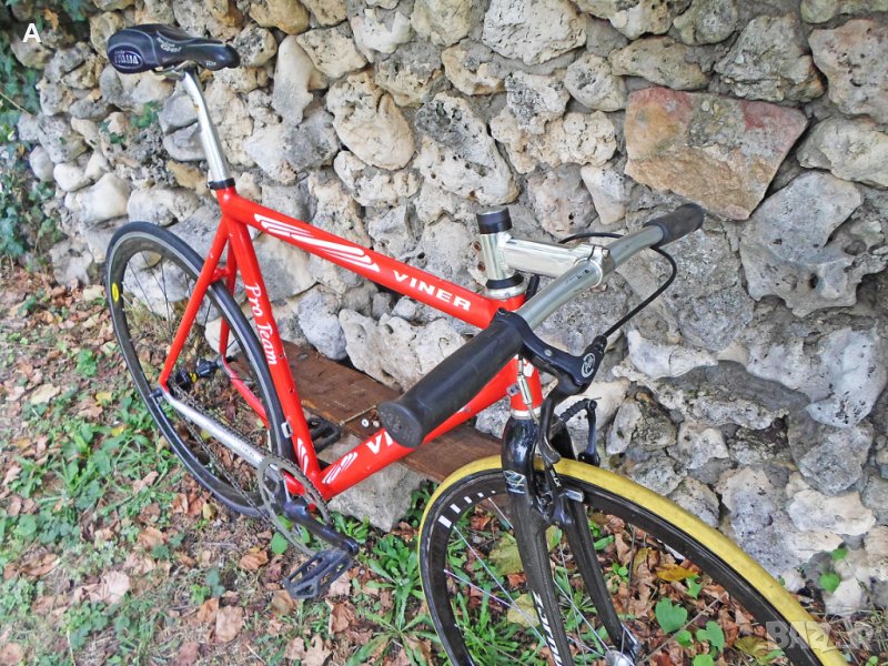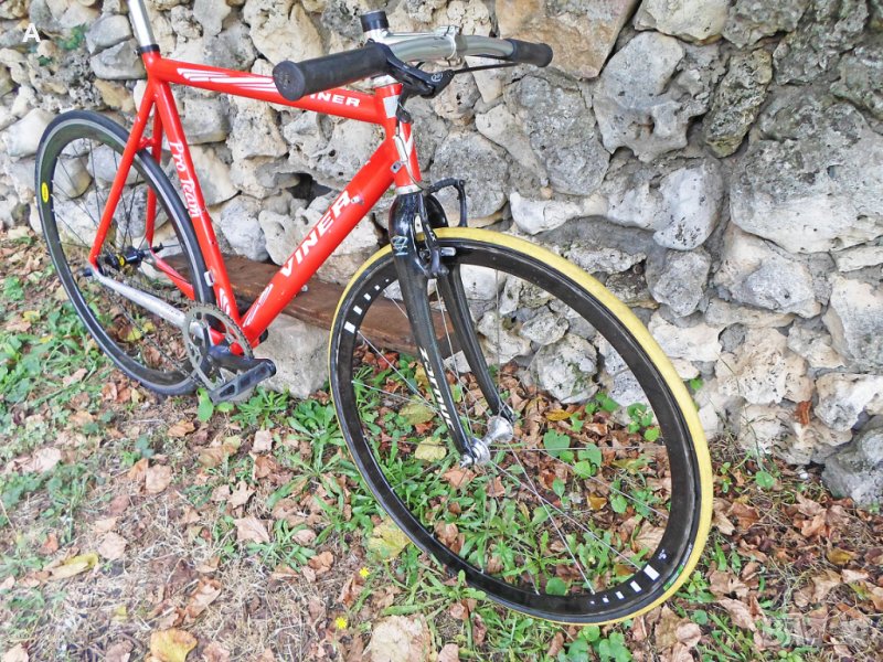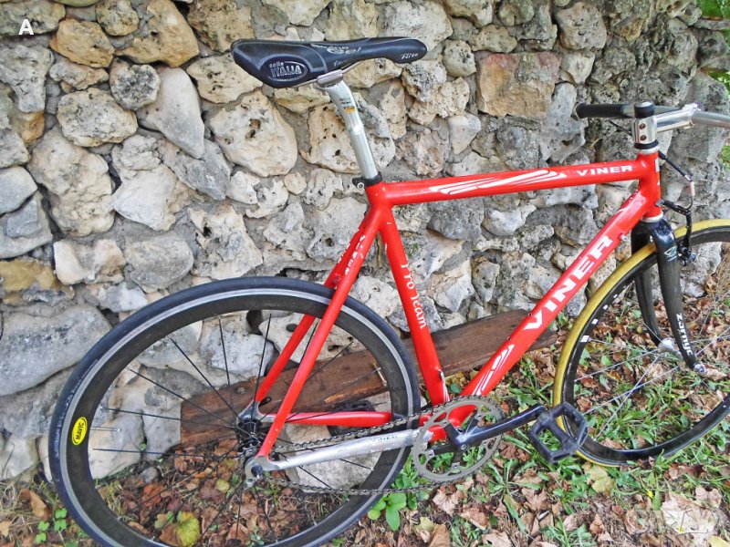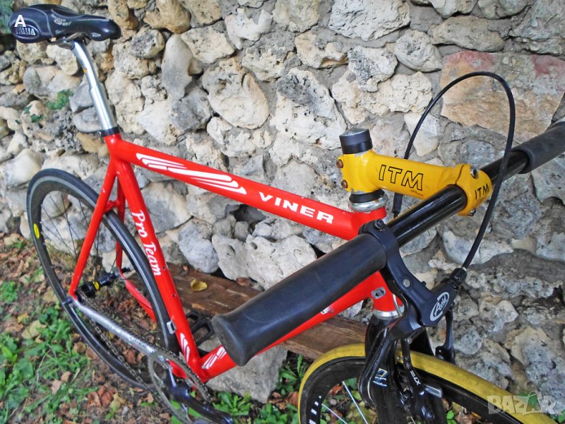 Мой проект сингъл/недовършен, нямам обтегач сингалатор/с излишни за мене части пуснати за продажба в обявите ми. Viner Pro Team шосейна алуминиева рамка 56 см вертикал/55 см хоризонтал с тегло около 1600 гр, с чело за вилка 1 inch !,седалкова тръба 27,2mm,италиански стандарт средно. Рамката има козметични забележки/подпухнала боя, за частично или цялостно пребоядисване /.Забележките на последните снимки.Цена 150 лв. Карбонова вилка 1 инч 150 лв. Предна капла Campagnolo 150 лв.Mavic задна капла клинчер 200 лв.Miche колче 60 лв.Selle Italia Flite Titanium 90 лв.