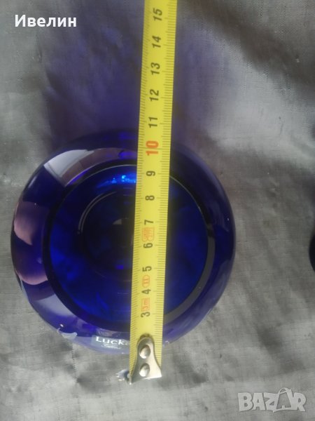 ваза в стил арт деко от синю стъкло,ръчно декорирана.,размери и състояние видни на снимките.