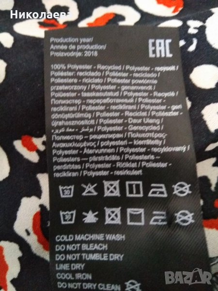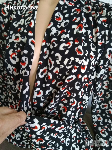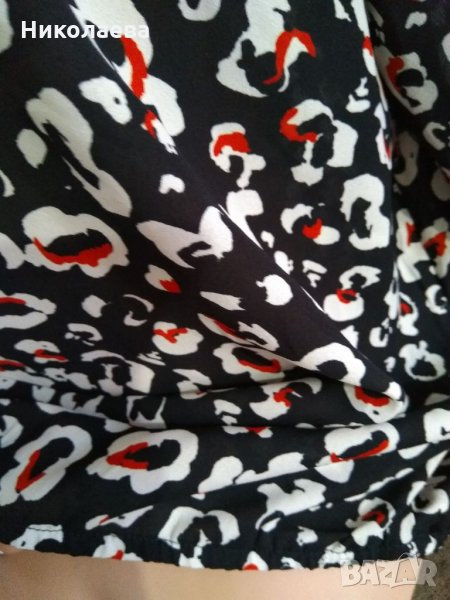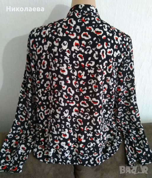 Елегантна немачкаема блуза с дълъг ръкав и прихлупване отпред,с ластик в долния край.В черно,бяло и червено.По етикет е М,но е уголемена и с кройка, която позволява носене и от L.