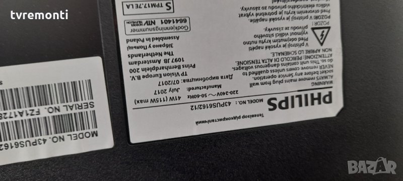 Основна платка 715G8709-M0E-B00-005N Борда е гарантирано работещ Демонтиран от телевизор PHILIPS 43PUS6162/12 със счупен дисплей TPT430U3-EQYSHM.G REV.S1V тествана от нашия техник