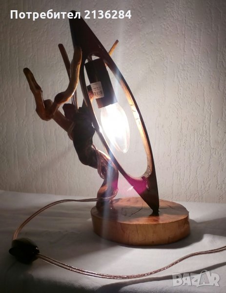 Ръчно изработена лампа. Основа от акация, клон от лоза и совалка. Височина 32см,дължина 20см.