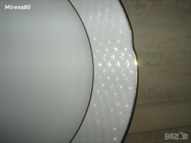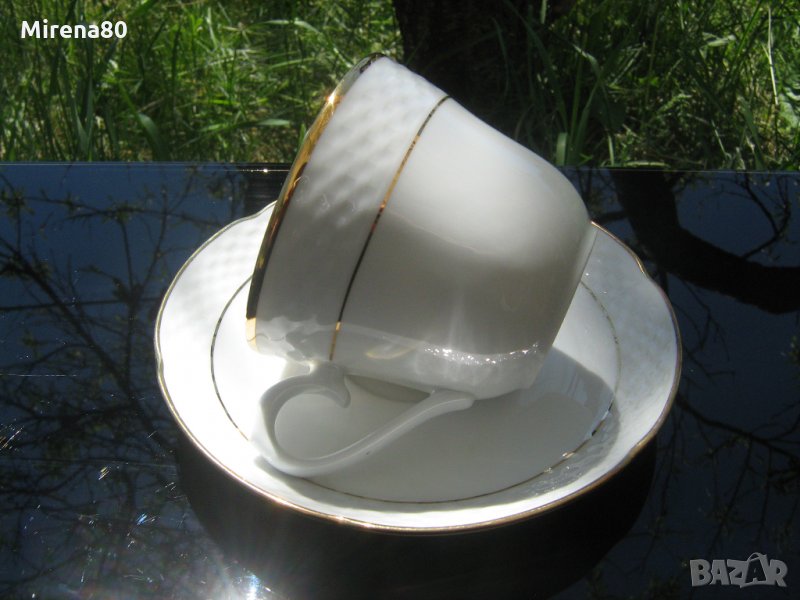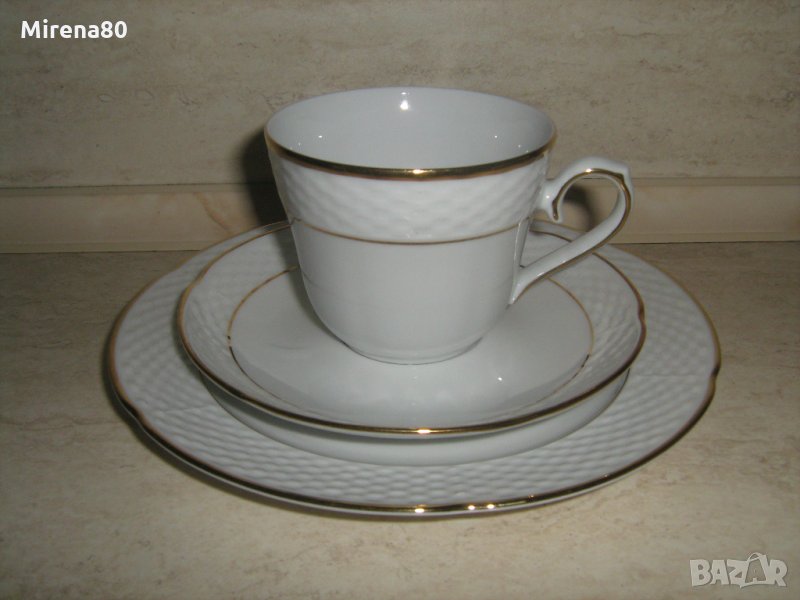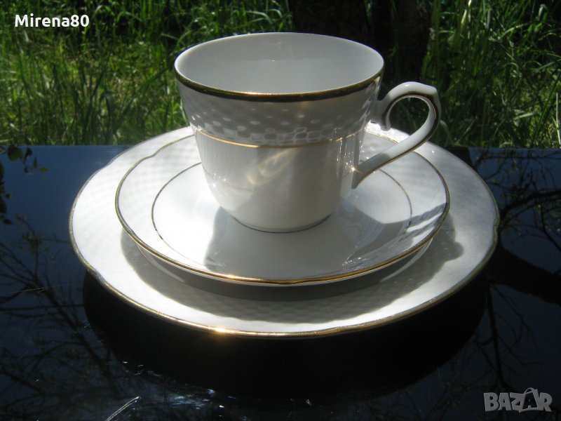 Троен порцеланов сет - чаша (ф 8.5 см, вс. 7 см), подложна чинийка (ф 15 см) + десертна чиния (ф 19.5 см). Нови, неизползвани, светят :)) Фабриката няма нужда от реклама, маркирани са за произход. Порцеланът е снежнобял, фин и изящен - прозира на светлина, с богат релеф и позлата. Класика и елегантност - сетът е едно малко произведение на изкуството.