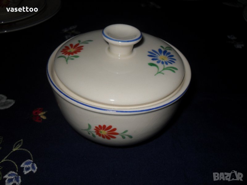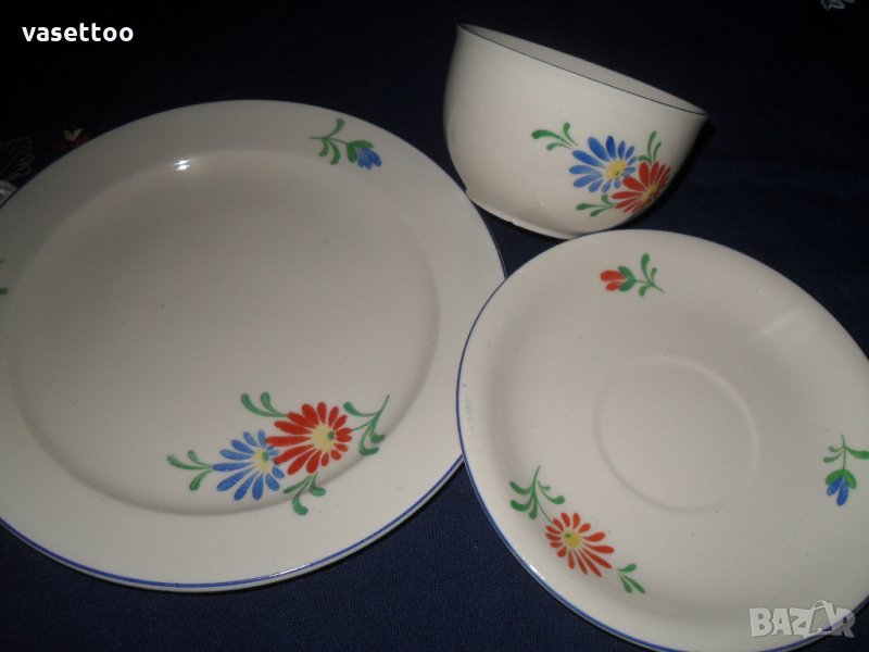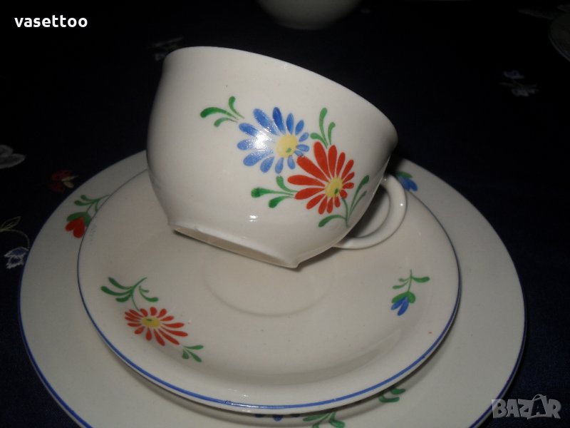 Много красив ръчно декориран сервиз за чай, включващ шест чаши 5,5/9см., подложни чиниики 14,5см., десертни чинии 19см. и захарница 8/11см. Перфектно състояние.