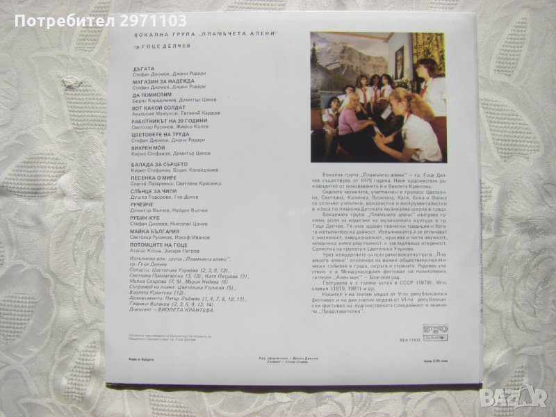 Грамофонна плоча - ВЕА 11433 - Вокална група "Пламъчета алени", гр. Гоце Делчев