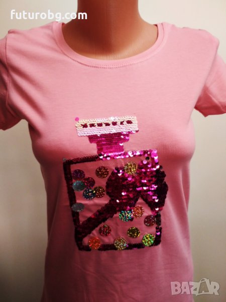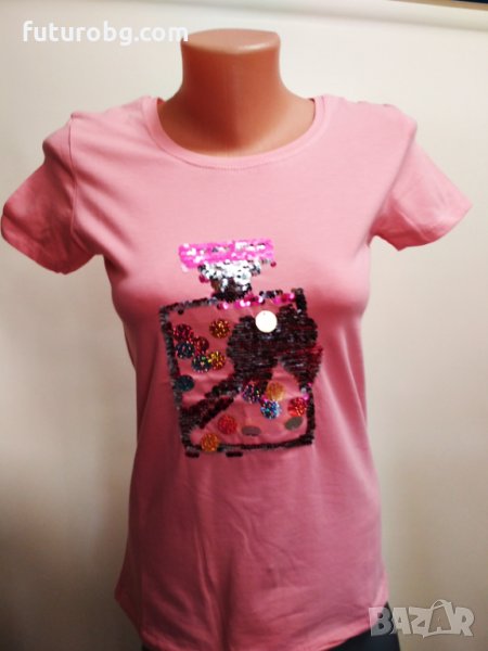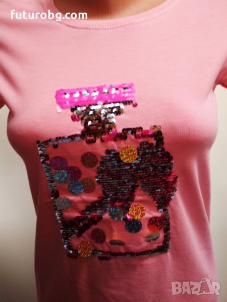 Розова дамска тениска с въртящи се пайети във форма на шише