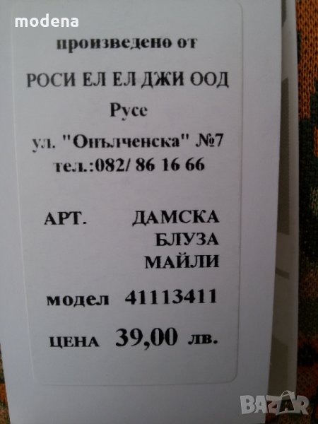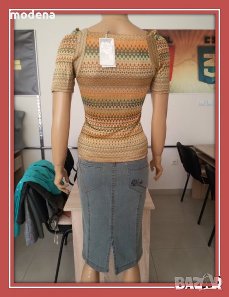 Дънкова Пола на русенската фирма Роси №44 Атина, състав - 98% памук, 2% еластан, намалена от 69 лв. Блузата е също на "Роси" размер S, цена10 лв, намалена от 39 лв.