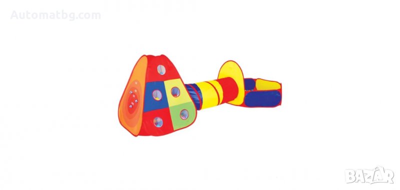 Палатка с тунел и малка детска площадка. Сцената има вход и е свързана с тунела.
