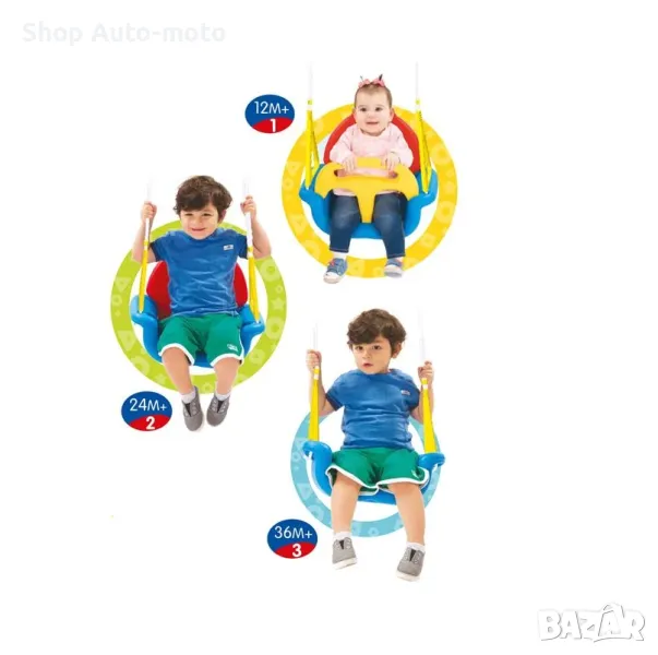 Детска висяща люлка 3 в 1 за различните етапи от развитието на детето. С използването на облегалката и предпазната ключалка е подходяща за деца до 12 месеца, с използването на облегалката е подходяща за деца от 12-24 месеца и без облегалката за деца над 36 месеца.