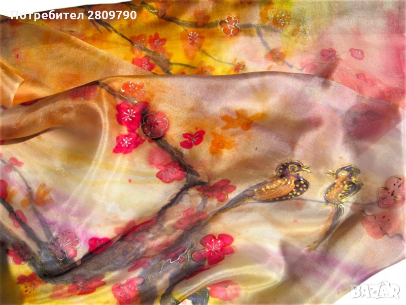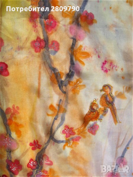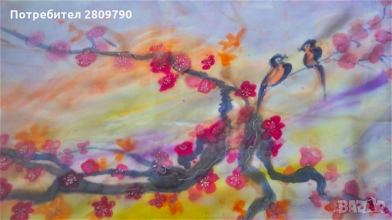 Шалът е направен от най-фината, безтегловна, течаща коприна понж-5 или ексельсиор (въздушна натурална коприна с плътност само 22 г /м²). Той е ръчно рисуван с екологични багрила, които се фиксират с пара за няколко часа, което придава на коприната допълнителен блясък и мекота. Ръбът на шала е зашит на ръка с копринени конци. Цъфтящата сакура винаги е била символ на пролетта, любовта и надеждата. Прелестните птици цвърчат един на друг песен на любовта, прелитайки от клон на клон. Нежните изтънчени цветове цветове ще придадат уникален шик и екстравагантност на вашият имидж. Шалът ще бъде най-добрият подарък за рожден ден, празник, в знак на благодарност към мама, приятел, любим, за сватба, за да се харесате през пролетта и по всяко време на годината.