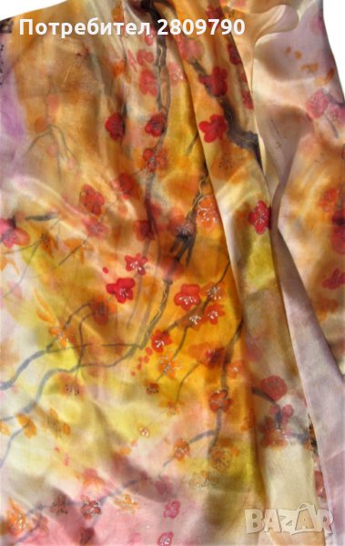 Шарф изготовлен из тончайшего, невесомого, струящегося шелка понж-5 или эксельсиор (воздушный шелк плотностью всего 22 г /м²). Он расписан вручную экологически чистыми красками, которые закрепляются паром в течение нескольких часов, что придает шелку дополнительный блеск и мягкость. Край шарфа прошит вручную шелковыми нитками. Цветущая сакура всегда была символом весны, любви и надежды. Милые птички щебечут друг другу песню любви, порхая с ветки на ветку. Нежные изысканные цвета придадут вашему образу неповторимый шик и экстравагантность. Шарф станет лучшим подарком на день рождения, праздник, в благодарность маме, другу, любимому человеку, на свадьбу, или порадовать себя весной и в любое время года.