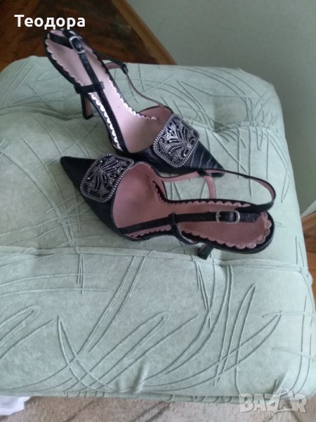 Елегантен модел от черна естествена кожа и красива декорация.Имат малко петънце на вътрешната стелка и това е съобразено в цената.