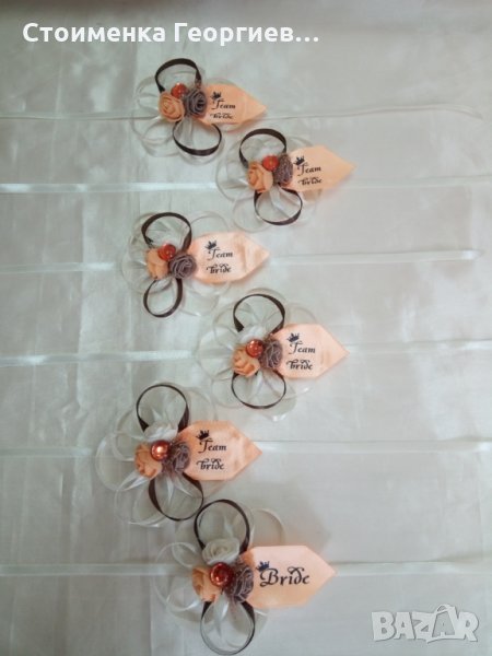 Бутониери за ръце с печат върху текстил, подходящи за моминско парти , или сватба, изработват се по поръчка с текст и цвят по избор.