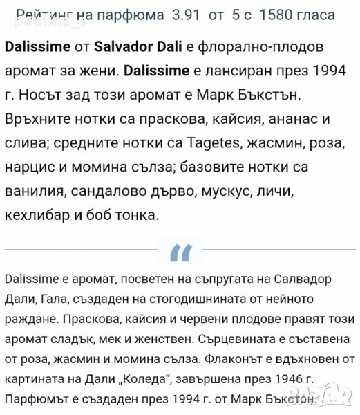 1️⃣ Salvador Dali / "Dalissime" 100ml EDT. Цената е крайна 79,99лв. Парфюм, част от личната ми колекция, в тестерна опаковка. Липсват 2 фъса за проба. Нов, с капачка. Моля, разгледайте и другите обяви и последвайте профила. Приятно разглеждане. Може да създадете пакет и да използвате доставката, тогава ще направя отстъпка от общата цена. При единична поръчка, цената не се коментира по никакъв начин, продажбата е с благотворителна цел! За лечение! Благодаря за вниманието и отделеното време 🙂