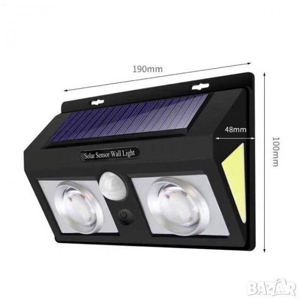 Автоматична соларна лампа за стена-зарежда се от слънчева енергия, модел CL-5066А, разполага с два COB фронтални светодиода, тези светодиоди са разположени зад две мощни лупи. Лупите разпръсквата светлината максимално добре. Два странични COB панела за по-добро осветяване което достига до 120 градуса.
