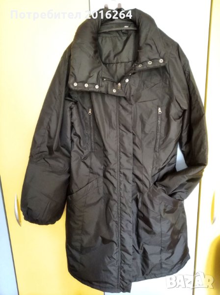 Дълго ватирано яке с ватирана шал яка, двупосочен цип с платка със скрити копчета тик-так отпред и предни джобове. С подплата и пълнеж от рециклиран полиестер. Размер EUR 44 (L).