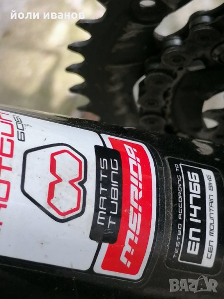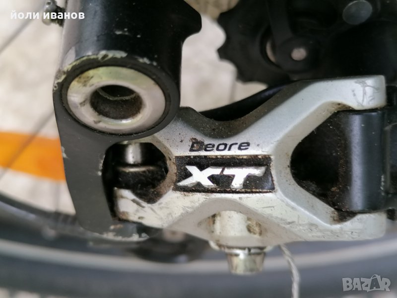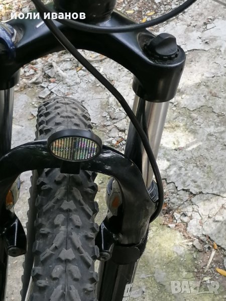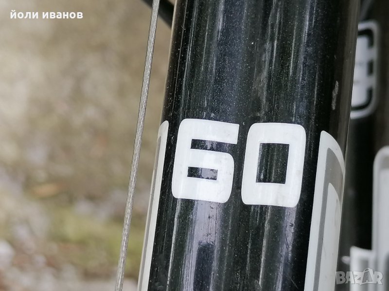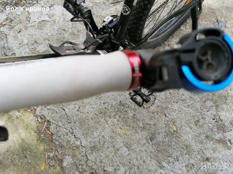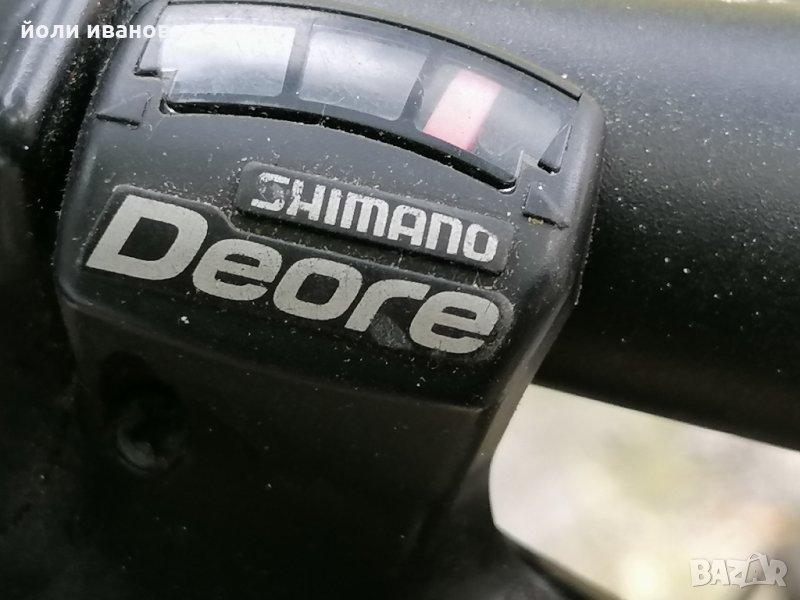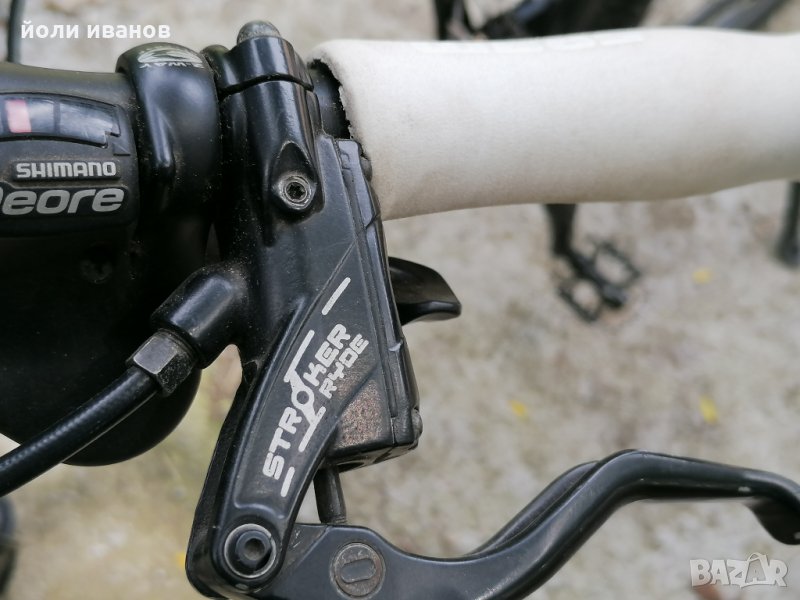 Алуминиева рамка размер 60 см,хидравлични дискови спирачки,качествена окомплектовка,вилка с реглаж,двойни капли,гуми 26 цола,стойка за велосипеда,рога на кормилото,27 скорости,палцови команди за скоростите шимано ДЕОРЕ,звънец,нови грипове СРАМ бели,широки гуми с големи грайфери,за труден терен.за висок мъж над 185см до 210см