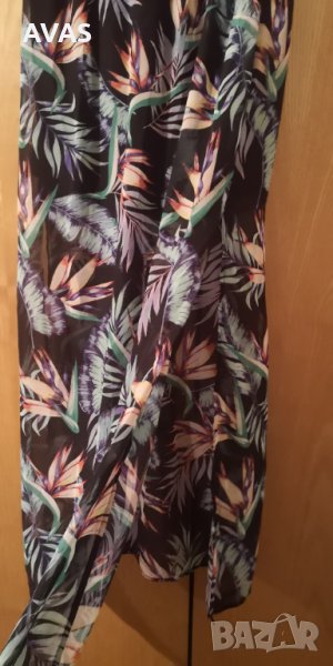 Воал с принт на листа джунгла. Има цепки отстрани. Отдолу има къс хастар, т.е изглежда като къса пола отгоре с дълъг воал, ластик в кръста.