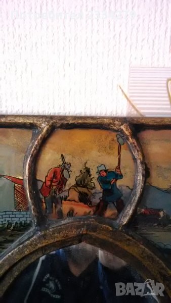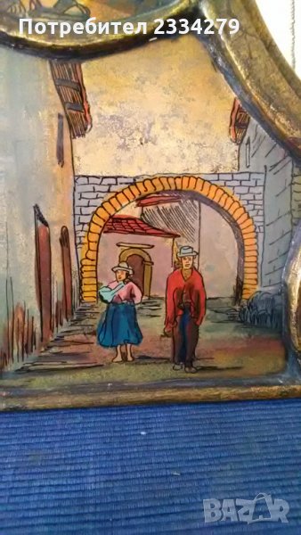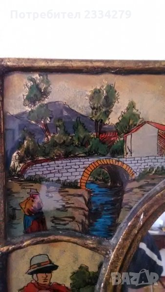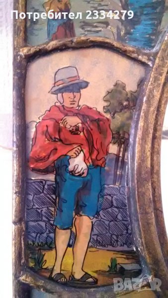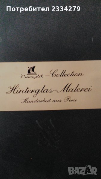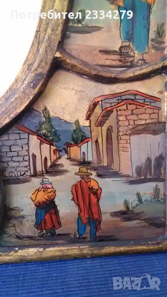 Стара картина със 8 ръчно рисувани на стъкло образи,а по средата има огледало. Всичко е ръчно изработено и рисувано,виж на гърба има етикет-сертификат, донесена в Германия от Перу. Закупена от бутик на изкуството в Германия. Единствен експонат,който няма да намерите,декорация или колекция за дома в битов стил. БЕЗ КОМЕНТАР.