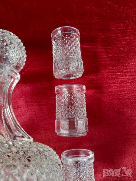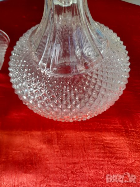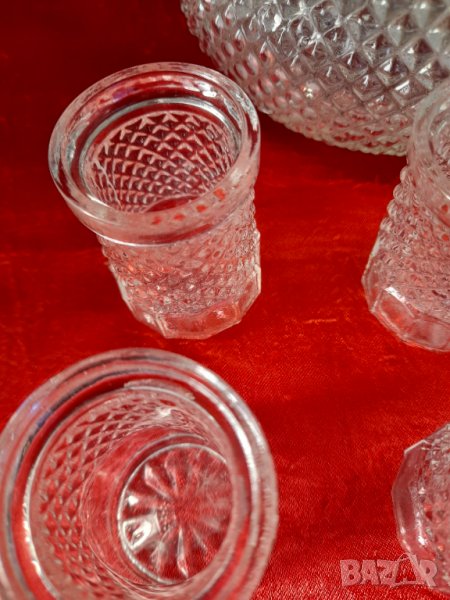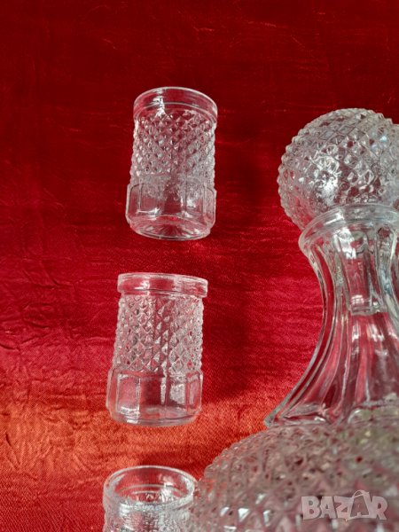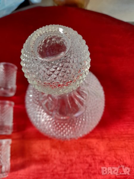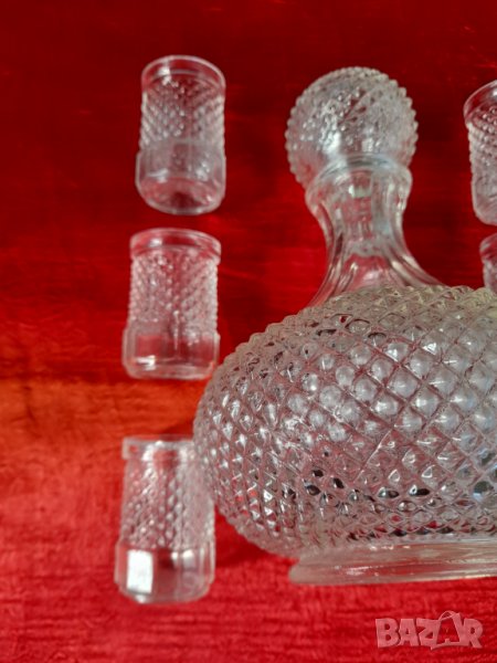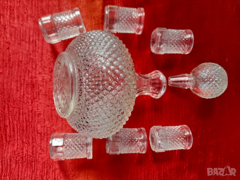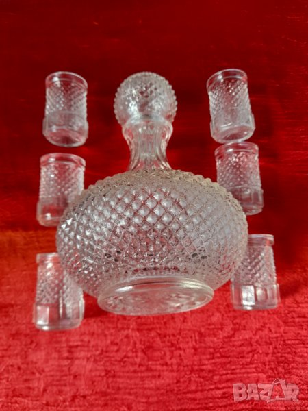 Стар кристален сервиз за спиртни напитки, Гарафа и 6 бр. чашки.Състояние видно на снимките никакви следи от употреба (няма пукнато,удари,чукнато и т.н.)Стават за подарък ,интериор,декор и по предназначение. Височина на гарафата 20 см,чашки 6 см